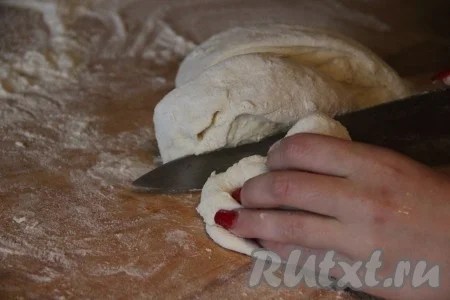 - Отдохнувшее тесто разделите на равные части, скалкой раскатайте каждую в тонкую пластину;