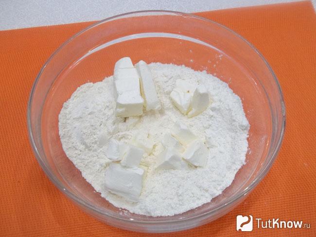 2. Холодное сливочное масло нарежьте кусочками и добавьте в емкость с мукой.